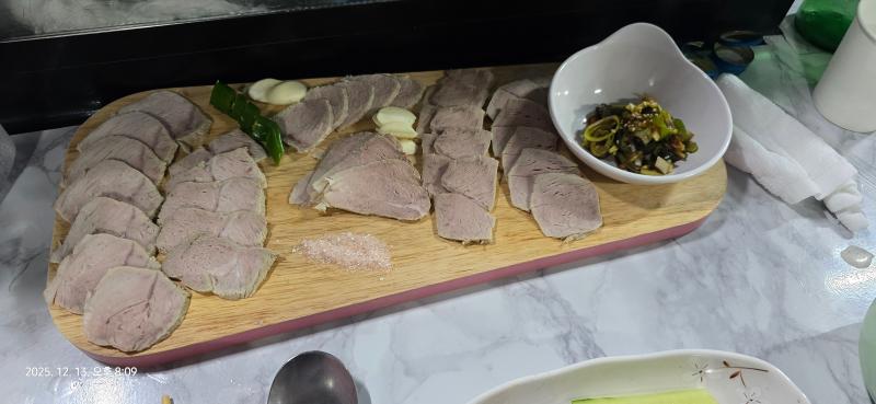 이 사진에는 삶은 돼지고기와 마늘, 고추장아찌가 보입니다. ### 영양 성분 분석 1. **삶은 돼지고기** - **단백질**: 근육 형성 및 회복에 도움 - **지방**: 에너지원으로 사용되며, 포화지방 섭취는 적당히 - **비타민 B군**: 에너지 대사에 도움 2. **마늘** - **알리신**: 항균 및 항염 효과 - **비타민 C**: 면역력 강화 3. **고추장아찌** - **비타민 C와 A**: 항산화 작용 - **식이섬유**: 소화에 도움 ### 건강한 식단 제안 - **채소 추가**: 다양한 색상의 채소를 곁들여 비타민과 미네랄을 보충하세요. - **탄수화물**: 현미밥이나 통곡물 빵을 추가하여 에너지를 보충하세요. - **균형 잡힌 식사**: 단백질, 탄수화물, 지방의 균형을 맞춰 섭취하세요. ### 운동과의 연관성 - **근력 운동 후 식사**: 단백질이 풍부하여 근육 회복에 좋습니다. - **유산소 운동 전후**: 적당한 양의 탄수화물과 함께 섭취하면 에너지원으로 유용합니다. 이 식단은 단백질과 비타민이 풍부하여 건강한 저녁 식사로 적합합니다. 추가적인 채소와 탄수화물을 포함하면 더욱 균형 잡힌 식사가 될 것입니다.