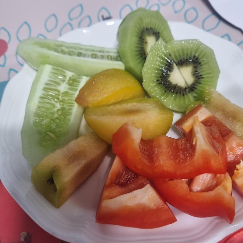 이 사진에는 다양한 과일과 채소가 포함되어 있습니다. 각 재료의 일반적인 영양 성분을 살펴보겠습니다. 1. **키위** - **칼로리**: 약 42 kcal (100g 기준) - **영양소**: 비타민 C, 식이섬유, 비타민 K 2. **오이** - **칼로리**: 약 16 kcal (100g 기준) - **영양소**: 수분, 비타민 K, 칼륨 3. **자두** - **칼로리**: 약 46 kcal (100g 기준) - **영양소**: 비타민 C, 비타민 K, 식이섬유 4. **빨간 피망** - **칼로리**: 약 31 kcal (100g 기준) - **영양소**: 비타민 C, 비타민 A, 식이섬유 ### 건강한 식단 제안 - 이 음식들은 모두 낮은 칼로리와 높은 영양소를 제공하여 다이어트나 건강한 식단에 적합합니다. - 다양한 색상의 과일과 채소를 섭취함으로써 다양한 비타민과 미네랄을 섭취할 수 있습니다. - 이 식단은 간식으로 좋으며, 단백질을 추가하고 싶다면 견과류나 요거트를 곁들여 보세요. ### 운동과의 연계 - 운동 전후에 섭취하면 에너지를 제공하고 회복을 돕습니다. - 특히 키위와 자두는 비타민 C가 풍부하여 면역력 강화에 도움을 줄 수 있습니다. 이러한 식단을 통해 균형 잡힌 영양 섭취를 유지하세요!