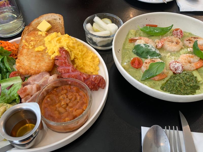 이 이미지에는 다양한 음식들이 포함되어 있습니다. 각 음식을 분석해보겠습니다. 1. **왼쪽 접시:** - **스크램블 에그**: 단백질과 지방이 풍부하며, 비타민 B12와 셀레늄 등의 영양소를 제공합니다. - **베이컨**: 단백질과 지방이 많지만, 나트륨 함량이 높습니다. - **구운 빵과 버터**: 탄수화물과 지방을 제공합니다. - **해시 브라운**: 주로 탄수화물과 지방으로 구성되어 있습니다. - **샐러드**: 비타민과 섬유질이 풍부합니다. - **구운 콩**: 단백질과 섬유질의 좋은 공급원입니다. 2. **오른쪽 접시:** - **새우 파스타**: 단백질(새우)과 탄수화물(파스타)이 주를 이루며, 소스에 따라 지방 함량이 다를 수 있습니다. - **페스토 소스**: 주로 지방(올리브 오일)과 향신료로 구성되어 있습니다. 3. **절임 무**: 저칼로리이며, 섬유질을 제공합니다. ### 영양 분석 및 식단 제안 - 이 식사는 다양한 영양소를 포함하고 있지만, 나트륨과 포화지방 함량이 높을 수 있습니다. - 아침이나 점심으로 적합하며, 운동 전후에 에너지를 공급하는 데 도움이 될 수 있습니다. - 균형 잡힌 식사를 위해 신선한 과일이나 더 많은 채소를 추가하는 것이 좋습니다. - 나트륨 섭취를 줄이기 위해 베이컨의 양을 조절하거나 대체할 수 있습니다. ### 건강한 식단 제안 - 아침: 오트밀, 신선한 과일, 견과류 - 점심: 닭가슴살 샐러드, 통곡물 빵 - 저녁: 구운 생선, 퀴노아, 찐 채소 균형 잡힌 식단을 유지하면서 다양한 영양소를 섭취하도록 노력하세요.