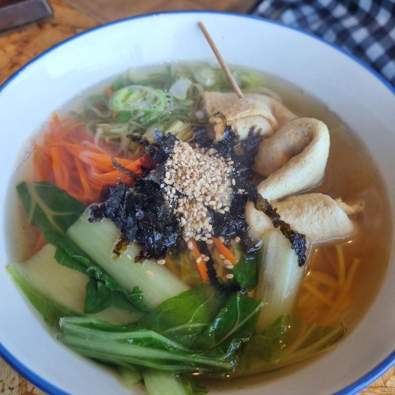 이 음식은 어묵탕으로 보입니다. 주요 재료로는 어묵, 채소(당근, 청경채 등), 김, 깨 등이 사용됩니다. 다음은 예상되는 영양 성분 분석입니다. ### 영양 성분 (대략적인 값) - **칼로리**: 약 300-400 kcal - **단백질**: 15-20g - **지방**: 5-10g - **탄수화물**: 40-50g - **섬유질**: 3-5g ### 건강에 미치는 영향 1. **단백질 공급**: 어묵은 단백질을 제공하여 근육 유지와 회복에 도움을 줍니다. 2. **비타민과 미네랄**: 채소는 다양한 비타민과 미네랄을 공급하여 면역력 강화에 기여합니다. 3. **저지방 식단**: 비교적 낮은 지방 함량으로 건강한 체중 관리에 도움이 됩니다. ### 추천 식단 - **아침**: 오트밀과 과일 - **점심**: 어묵탕과 현미밥 - **저녁**: 구운 닭가슴살과 샐러드 이 식단은 균형 잡힌 영양 섭취를 도와주며, 운동 후 회복에도 좋습니다.